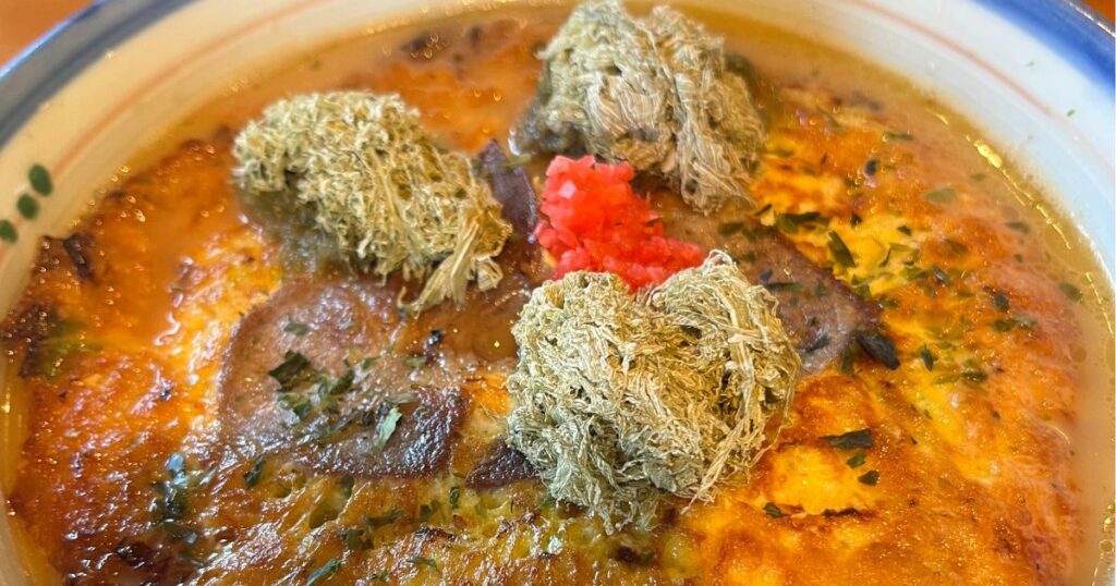 豚骨スープのラーメンの上に、お好み焼き風のトッピングがどーーん!