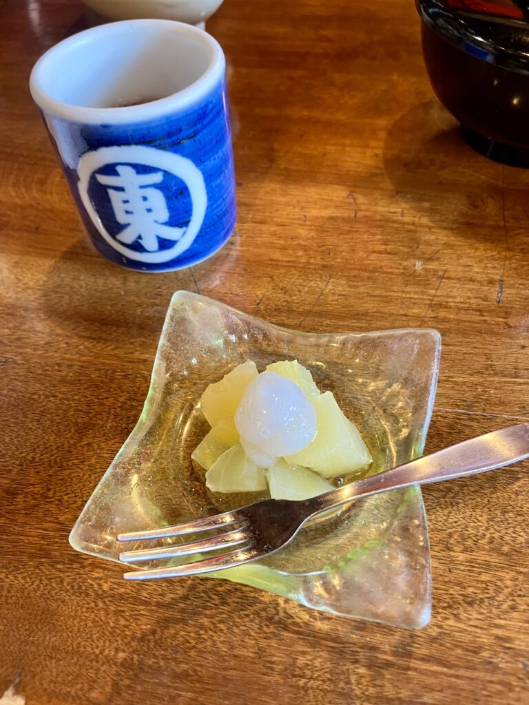 今回頼んだわんこそばコースは、お刺身・漬物付き。